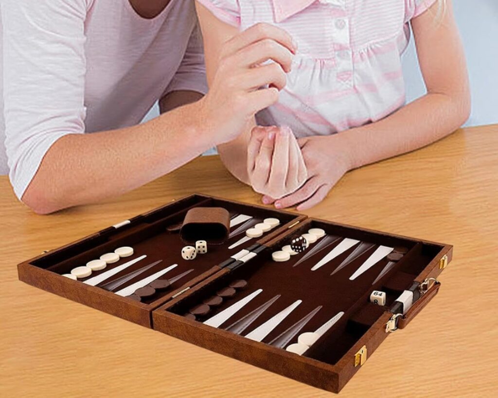 O tabuleiro possui 24 triângulos chamados casas, divididos em quatro quadrantes. As peças são distribuídas na configuração inicial padrão, garantindo equilíbrio para ambas as partes.