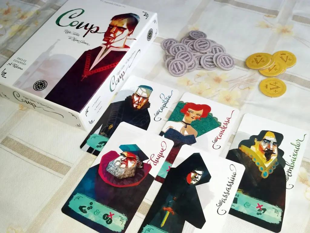 Desenvolvido para três a seis jogadores, o Coup é um jogo de cartas que enfatiza a habilidade de blefar e tomar decisões rápidas. Os participantes usam cartas para representar ações como roubar moedas ou assassinar rivais, mas sempre com o risco de serem contestados.