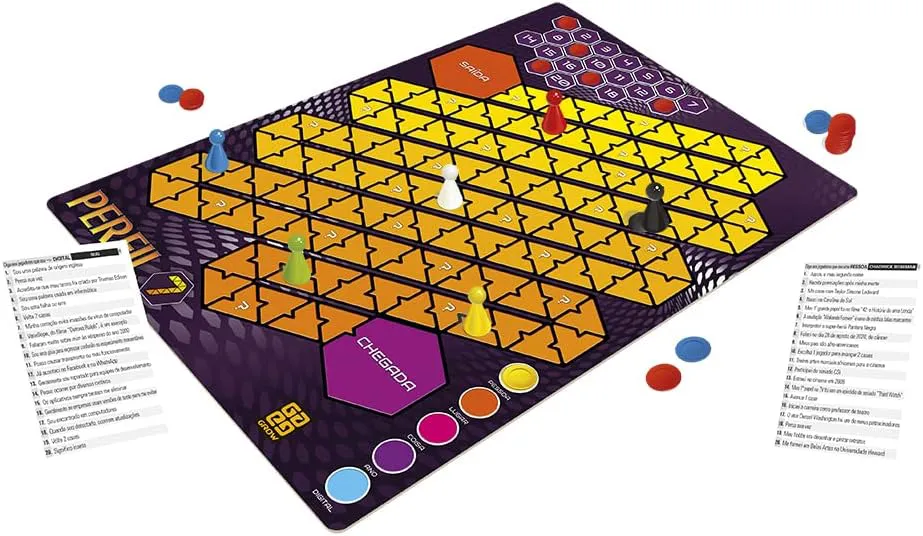 Perfil é um jogo de dedução que combina tabuleiro e cartas, ideal para quem gosta de desafios intelectuais. Com mais de 390 cartas contendo perfis variados — pessoas, lugares, anos e objetos — o jogo exige que os participantes descubram o perfil secreto a partir de pistas sequenciais. Suporta de 2 a 6 jogadores, promovendo interação e competição saudável.
